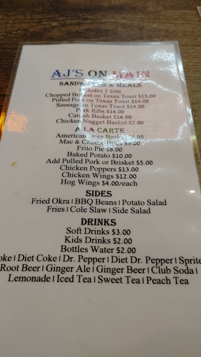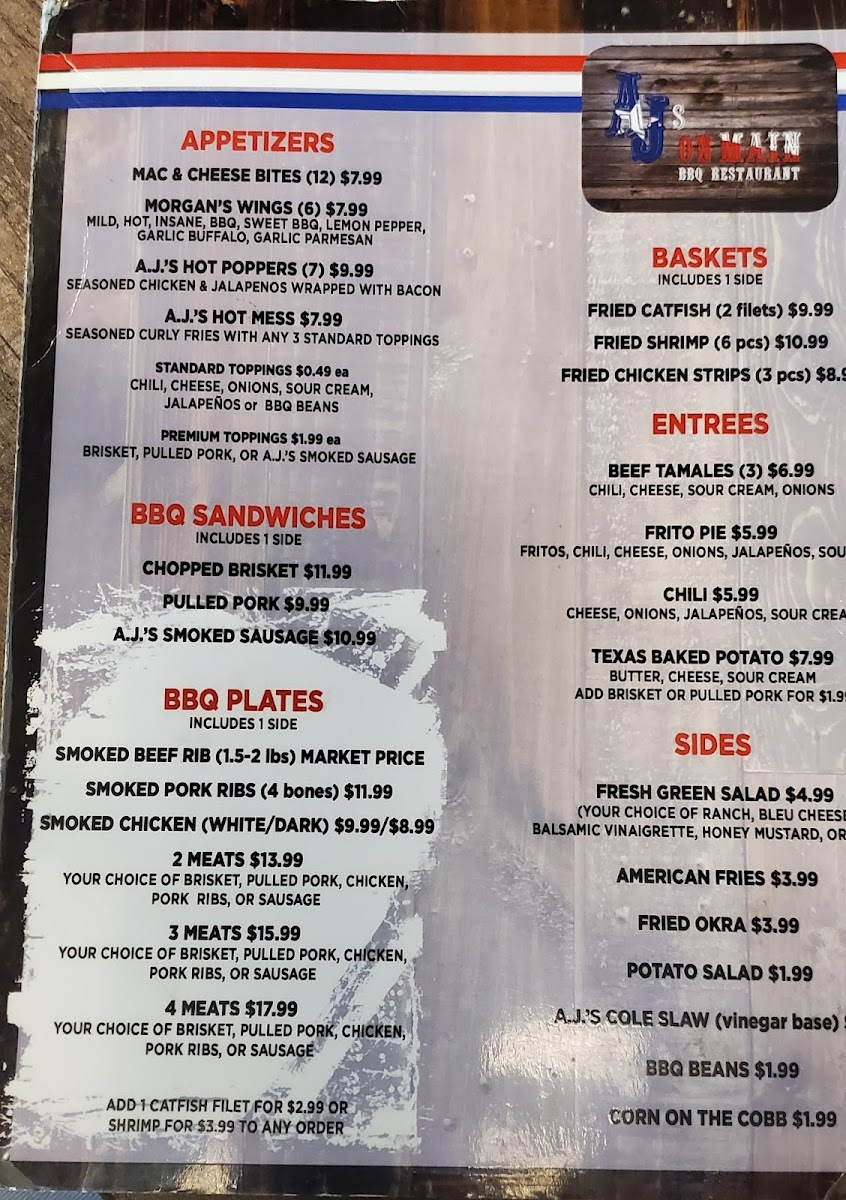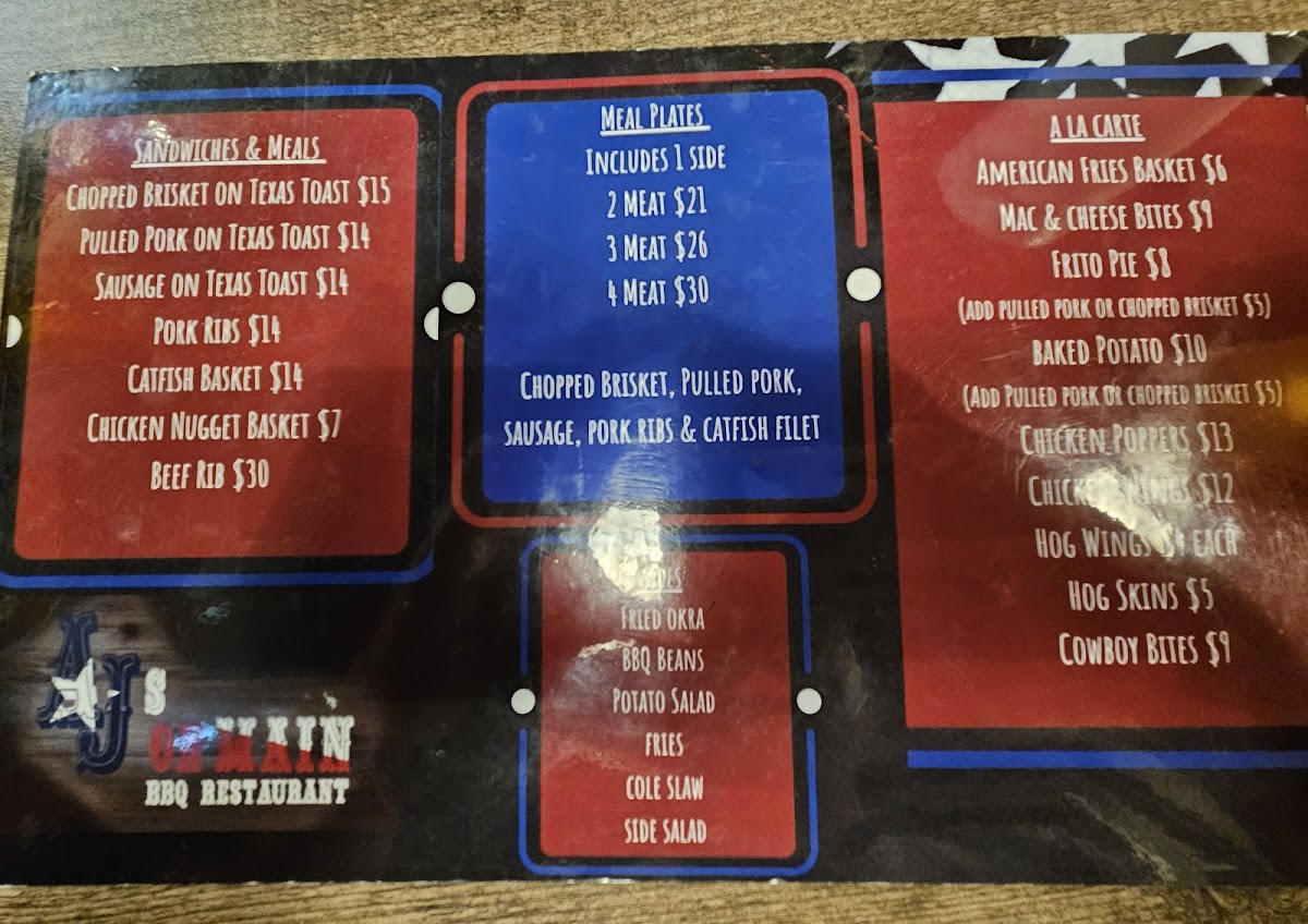 Welcome to AJ's On Main, a charming BBQ haven located at 651 S Main St, Grapevine, TX. This establishment captures the essence of Texas hospitality with its inviting atmosphere and delicious fare. AJ's menu offers hearty meal plates, featuring options like the 4 Meat Combo, boasting brisket, pulled pork, pork ribs, and even a catfish fillet for $31.